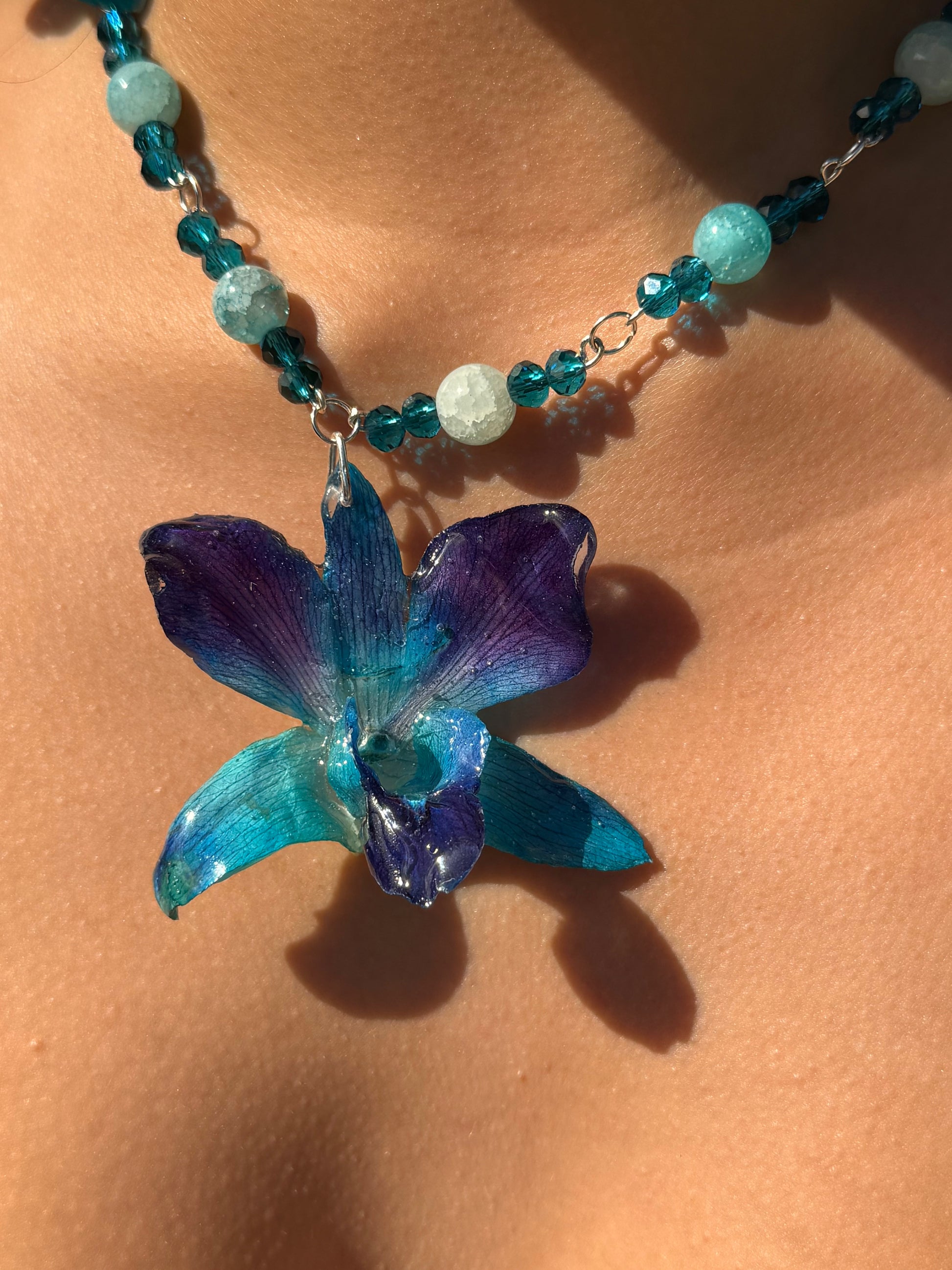 Natural blue orchid with purple sparkles e n c a p s u l a t e d in resin