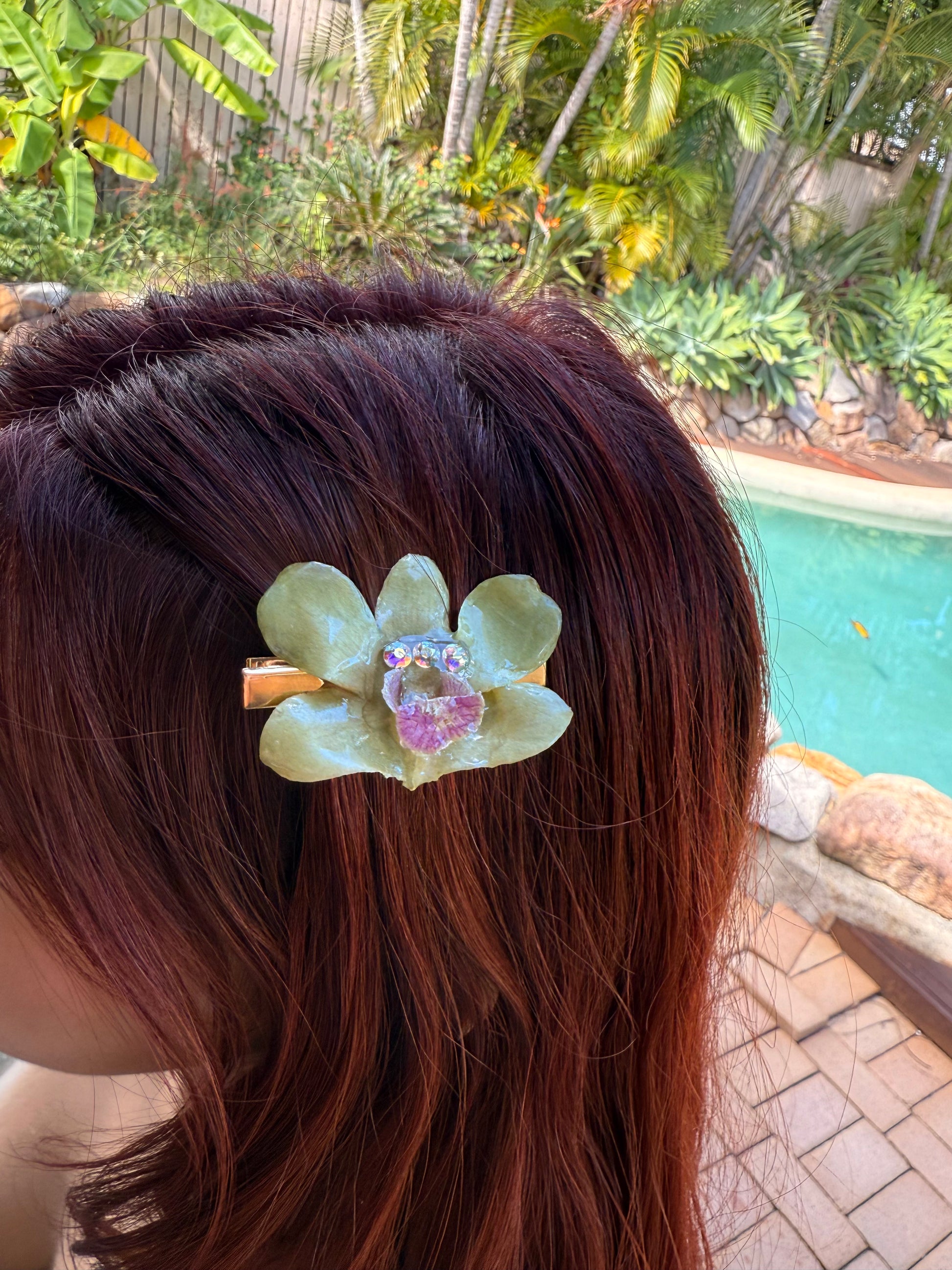 Aqua and purple orchid hair clip with sparkling crystals on a