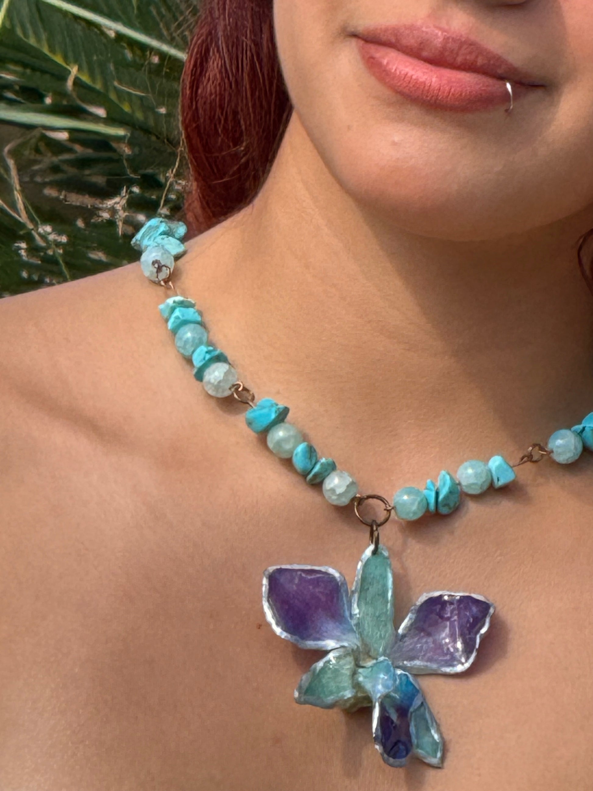 Natural orchid p r e s e r v e d in resin, t u r q u o i s e and a m e t h y s t s t o n e s