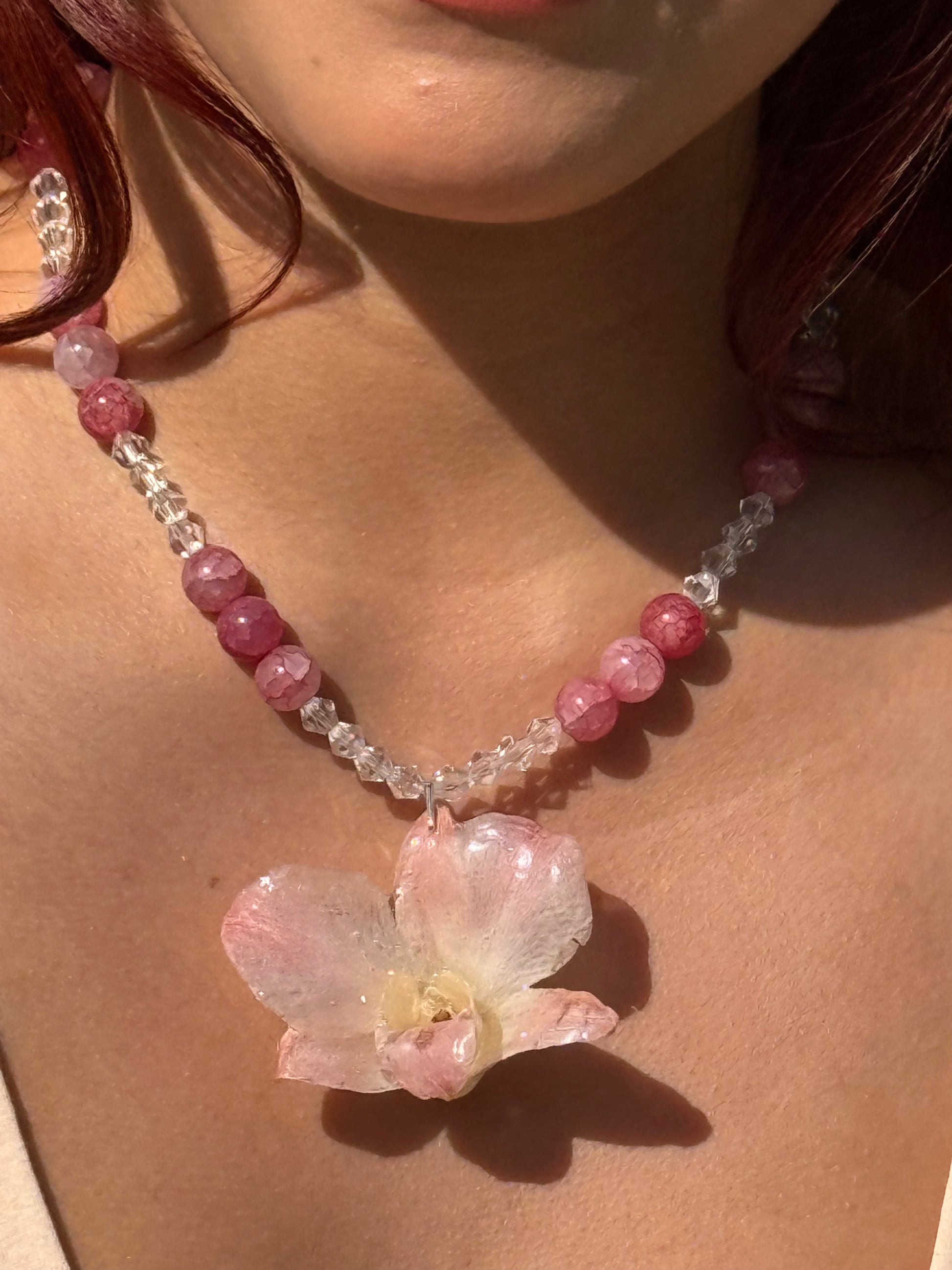 Collar con orquídea natural Rosa con pastel y c u e n t a s de cuarzo